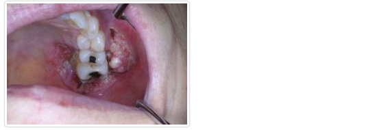 口の中にできるがんは口腔がんと呼びます。この中には舌癌(写真1)、舌と歯ぐきの間にできる口腔底癌(写真2)、歯ぐきにできる歯肉癌(写真3)、頬の内側の粘膜にできる頬粘膜癌、口の上ブタ(天井)にできる硬口蓋癌が含まれます。これらの中でもっとも頻度の多いものは舌癌で、歯肉癌、口底癌、頬粘膜癌などの順でみられます。口腔がんは日本での全がんの2%程度しかありませんが、直接生命にかかわる重大な病気であることには違いはありません。口腔がんによって「食べる」、「飲む」、「話す」、「呼吸する」などといった、私たちのQOL(quality of life=生活の質)に直接深く結びついているお口の働きが大きく妨げられ、QOLが著しく低下してしまう場合があります。
