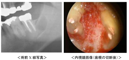 歯根囊胞(歯の根の先に膿の袋ができる病気)は外科的に摘出され,歯根端切除・逆根管充填術(根の先を削り,根の後ろから詰め物をします)が行われますが,臼歯部(奥歯)では視野の問題でその適応が困難とされているため,抜歯せざるをえない状況でした。そのため,われわれはできる限り自分の歯を残し使用し続けることを目指して,内視鏡を導入しました。内視鏡を使用することで従来では観察困難であった臼歯部でさえ,良好な術野のもと歯の保存(温存)が可能となっており,現在では安定した治療結果が得られています。